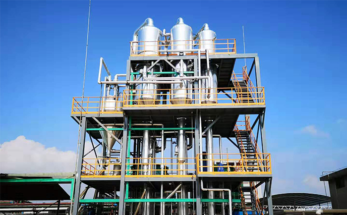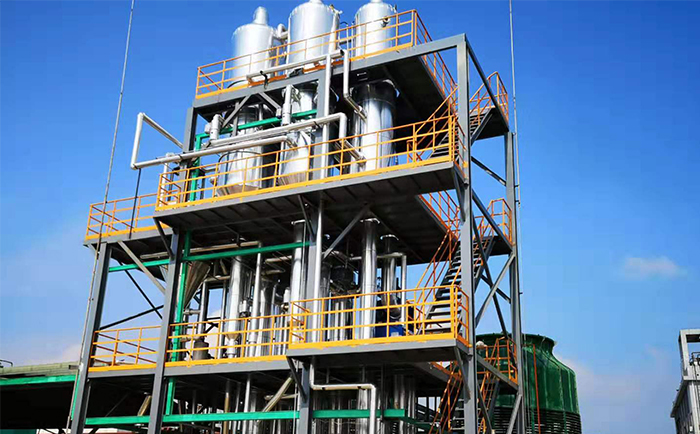 三效蒸發(fā)器主要由相互串聯(lián)的三組蒸發(fā)器、冷凝器 、鹽分離器和輔助設(shè)備等組成 。